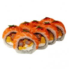 Ryż, nori, łosoś norweski, serek kremowy, krewetki w tempurze, mango, sos Mango-Chilli, szczypiorek
