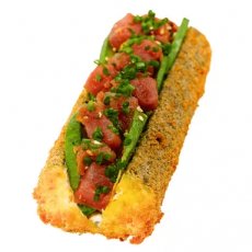 Ryż, nori, serek kremowy, awokado, tuńczyk Bluefin, olej sezamowy, szczypiorek, panierka panko, sos Unagi.