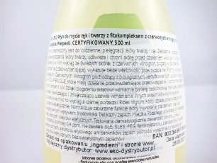 Płyn do mycia rąk i twarzy z fitokompleksem z czerwonych winogron został stworzony na bazie naturalnych substancji i aktywnych składników roślinnych z biologicznych upraw. Przeznaczony jest do codziennej pielęgnacji skóry twarzy. Delikatnie oczyszcza, odświeża oraz chroni skórę przed działaniem wolnych rodników. Zawarty w płynie wyciąg ze świeżych skórek z czerwonych winogron, bogaty w polifenole (działanie przeciwutleniające) wykazuje również właściwości przeciwzapalne.