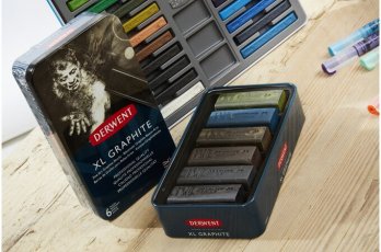 Naturalny grafit jest nieco sypki, dlatego łatwo go rozcierać i tworzyć przejścia tonalne. Grafit XL Derwent stwarza nowe dodatkowe możliwości: bardzo dobrze kryje, świetnie nadaje się do rysunków brył i tworzenia na nich światłocieni. Można także dodawać do niego wody tworząc wielobarwne plamy. Występuje w 6 kolorach: dwóch naturalnych, dwóch ciepłych i dwóch zimnych.