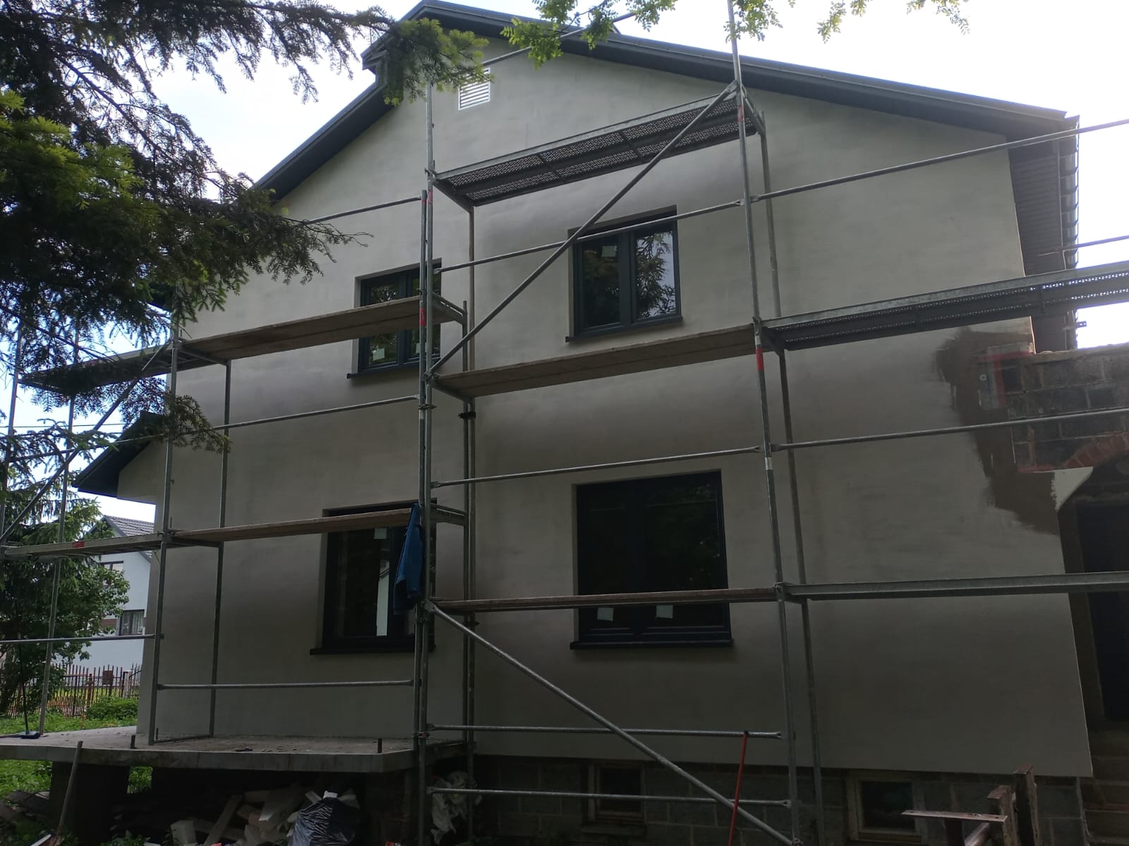 Wykonujemy wszystkie etapy prac elewacyjnych od przygotowania podłoża aż po końcowe malowanie lub nałożenie tynku.