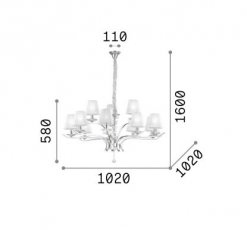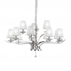 Rodzina lamp Pegaso. Metal Chrom lub Satynowany Mosiądz. Abażury z organzy. Dekoracyjne elementy z ciętego kryształu. Bogata rodzina lamp składająca się z kilku lamp wiszących, kinkietu, lampy podłogowej oraz lampek.