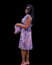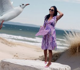 Sukienka włoska do kolan ,kolor fioletowy. Wykonana ze zwiewnego materiału pięknie się układa. Skład materiału 100%poliester, 95%viscosa,5%elastam,Z tyłu drobne gumeczki, dzięki nim sukienka dopasuję się do figury. Dekolt w szpic, pięknie podkreśla biust. Dzięki tym gumeczkom pasuje na rozmiar. M,L a nawet małe XL
