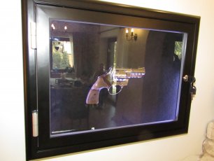 Wymiary 59x45 głębokość w środku 5cm , profil aluminiowy malowany, podświetlenie led.