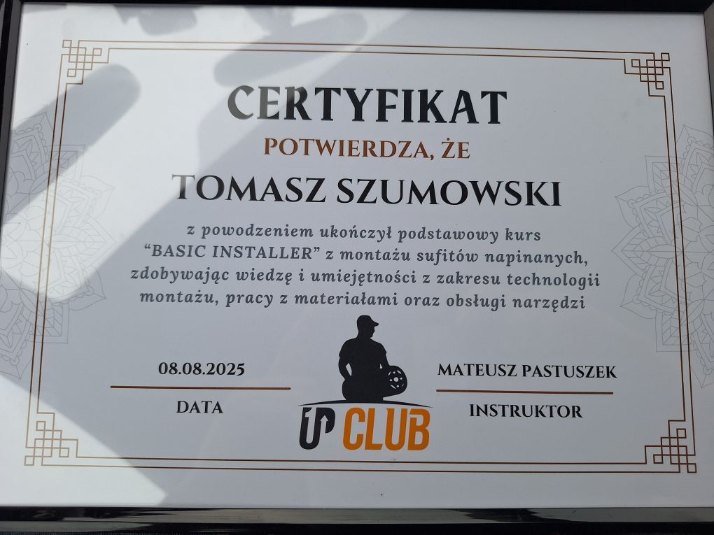 Tomasz Szumowski posiada certyfikaty potwierdzające ukończenie profesjonalnych szkoleń montażowych, w tym „BASIC INSTALLER”.
