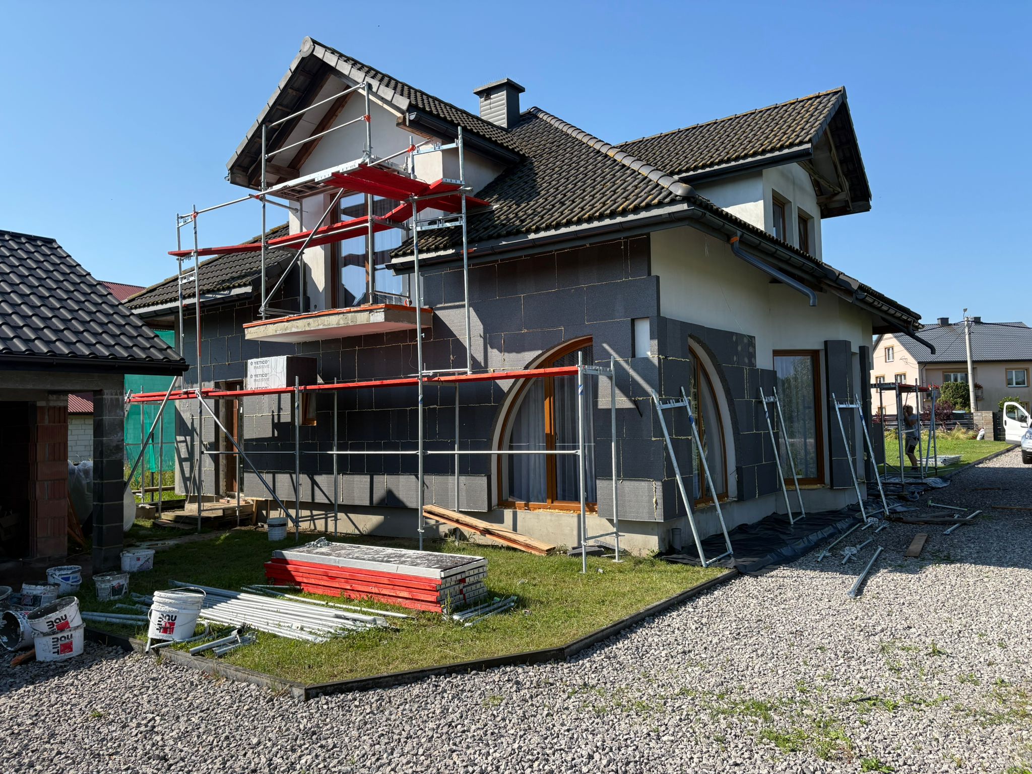 Wykonywane są warstwy izolacyjne, zbrojenie oraz tynki elewacyjne.